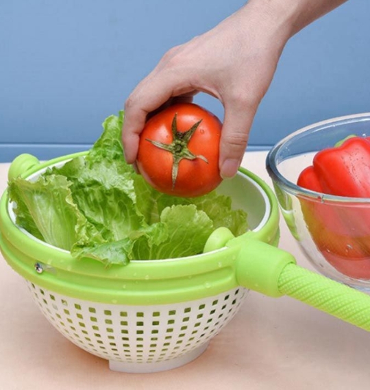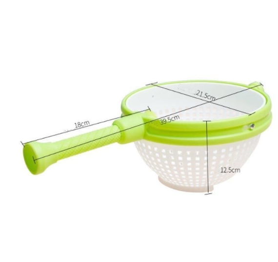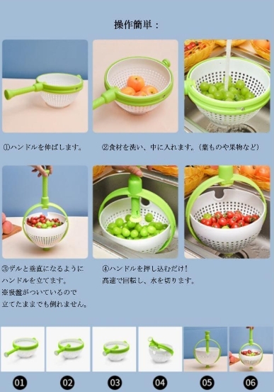 サイズ :F サイズについての説明:F 直径21.5cm 高さ12.5cm 最長39.5cm 素材:ABS 色:写真色 野菜の鮮度と水切りが大切!ハンドル付きの水切りザル。 持ち手は高速の回転を止めても滑りにくくできています。 シンクの中でハンドルを垂直に押し込むと、ザルが回転して遠心力で水を切れます。 切り穴が施されており、ボウルに溜まった水を簡単に捨てられます。 水切り機能付き、果物や野菜を浸せ、収納ボックスとして使用も最適です。 収納時は、ハンドルを短く押し込み、省スペースで収納できます。 操作簡単: 1.ハンドルを伸ばします。 2.食材を洗い、中に入れます。(葉ものや果物など) 3.ザルと垂直になるようにハンドルを立てます。 ※吸盤がついているので立てたままでも倒れません。 4.ハンドルを押し込むだけ! 高速で回転し、水を切ります。
