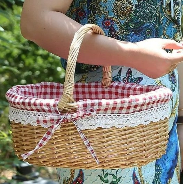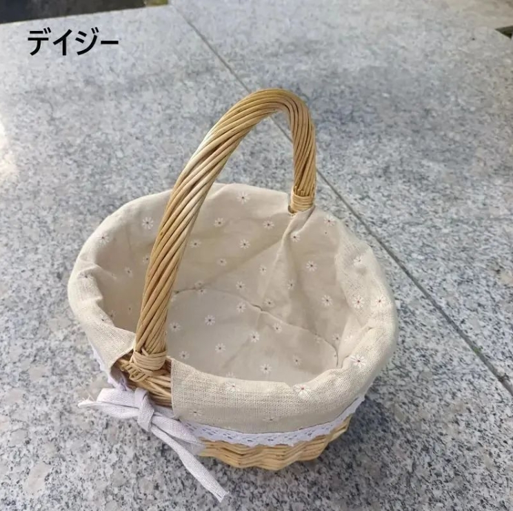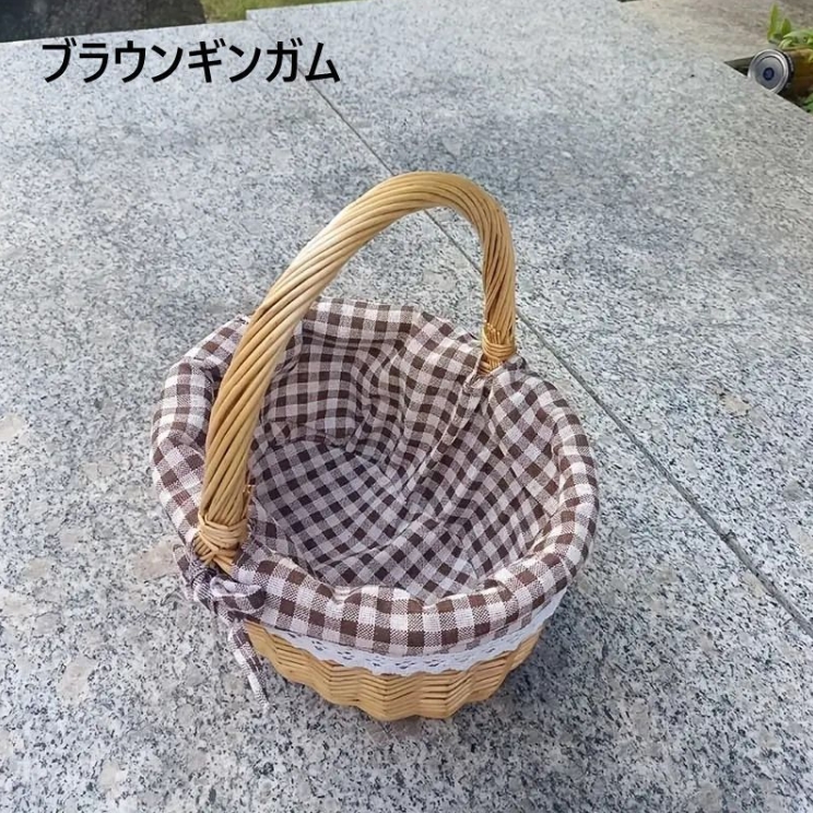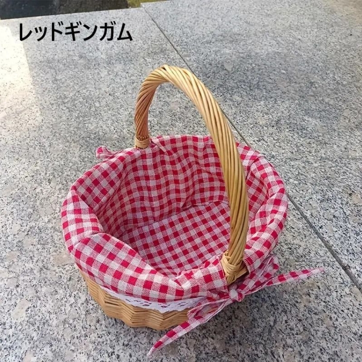 ■商品説明 かわいいお洒落なピクニックバスケットが登場しました♪ ピクニックに持っていくと雰囲気が上がってピクニックが一層楽しくなりますよ! ピクニックに合うだけでなくお野菜を入れたり、果物を入れたりして保管してもとってもお洒落でかわいいですよ。 お買い物に持って行っても気分が上がること間違いなしです。 ■サイズ 幅24cm x 奥行き21cm x 高さ13cm ■カラー(5カラー) ①ブラウンドット ②ブラウンギンガム ③レッドギンガム ④デイジー ⑤英字 ■素材 枝