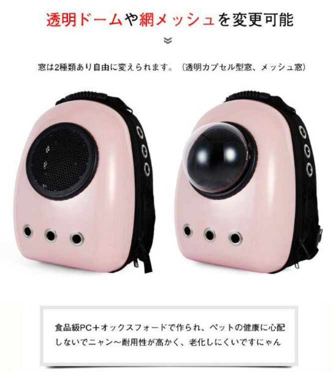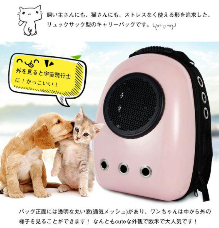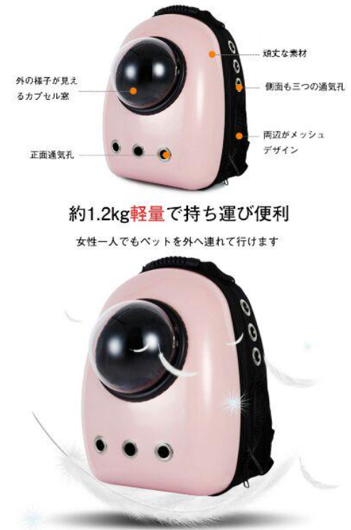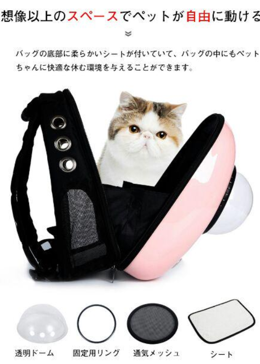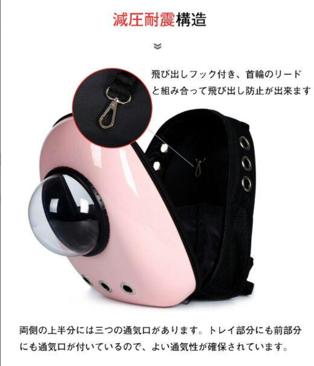 商品名:ペット用キャリーバッグ 素材:食品級PC+オックスフォード生地 カラー:ブラック、ピンク、フルーツグリーン ペット荷重:(約)猫6.5KG以内/犬5KG以内 バッグ重量:1.2kg バッグサイズ:42cm*32cm*29cm 透明ドーム:高密度アクリル 透明ドーム直径:約17cm セット内容:バッグ、透明ドーム*1、通気メッシュ*1、シート*1 使用対象:猫、小型犬、ペット 活躍場合:子猫の通院、お出かけ、お散歩など 生産国:中国 ※輸送中に商品を保護するために、バッグに透明フィルムを貼ってあるのをご了承ください。 ★クリアな窓がついているため、ペットは外の様子を存分に眺めることができます。ユニークな外観で、宇宙飛行士のようなペットたちの様子を見て、可愛すぎて気持ちも良くなります。 ★バッグ正面には透明な丸い窓があり、ワンちゃんは中から外の様子を見ることができます! なんともcuteな外観で欧米で大人気です! ★見た可愛いだけではなく、ペットの安全と快適性も大切にします。巧みなデザインは、通気性を重視し、12個の通気孔+側面メッシュの四面通気デザインで、空気の流通を保障します。 ★リュックの仕様で、省力でき、両手も解放します。ペットの出入りも楽々で、お出かけ、旅行、通院にも最適です。飛び出し防止フック付き、脱走することも防止できます。 ★より固いPC材質の殻ので、バッグ変形にくく、バッグ内のペットちゃんによりよい保護を与えられます。 ★軽くて楽々前抱っこ出来る、後ろ掛け、リュックとしても使える。 リュックは両手が空くので、あっちこっち動き回る旅行やお出かけに最適! ★車載、携帯、スーツケースなど利用できます。収納と持ち運びもとても便利です。 車の座席に固定するだけでなく、リュック機能付き、肩をかけても使用することができる。