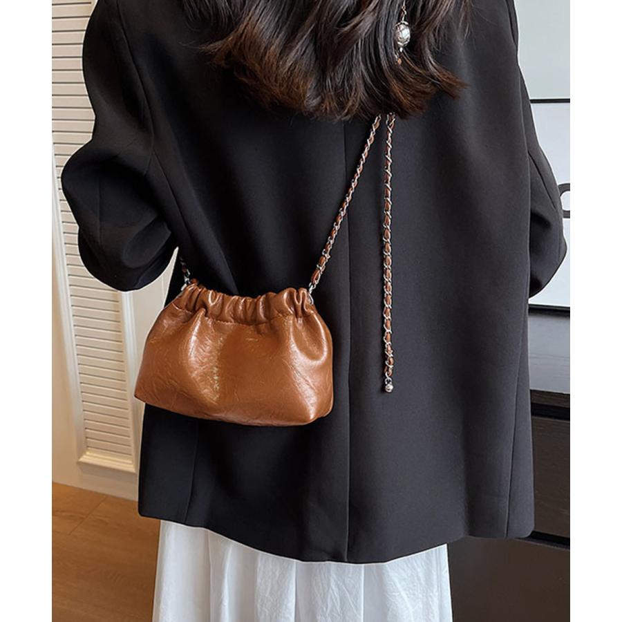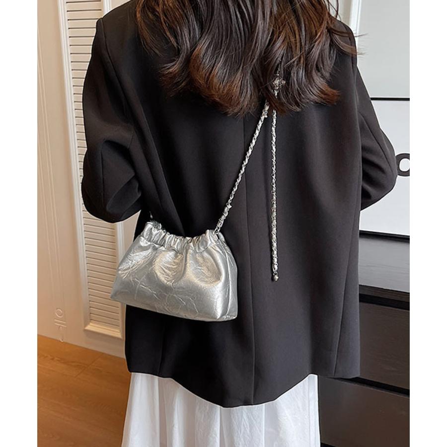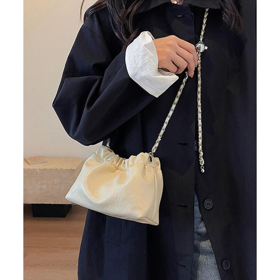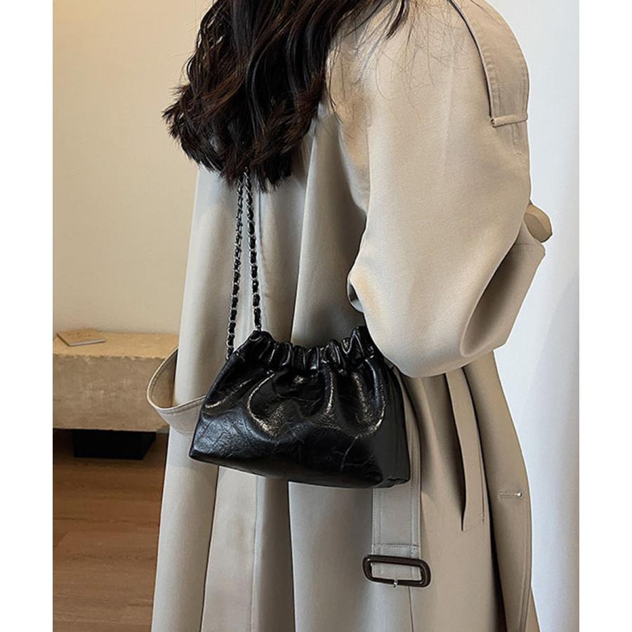 上品な光沢感とエレガントなデザインが魅力のモダンな巾着型ショルダーバッグ。