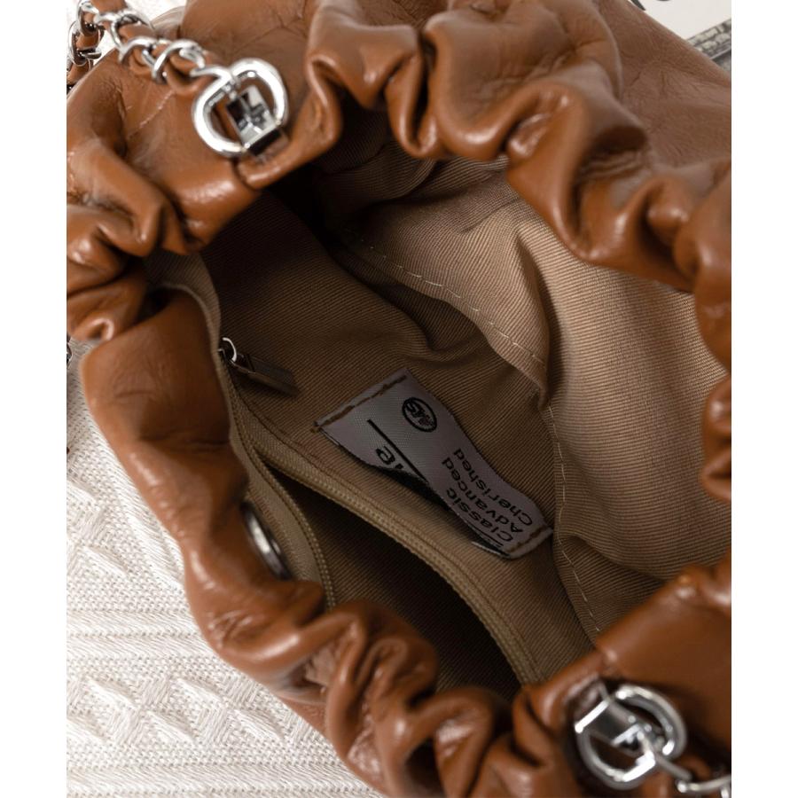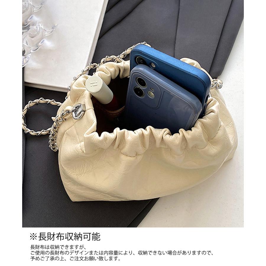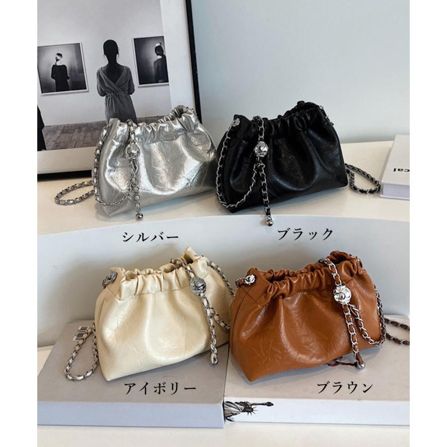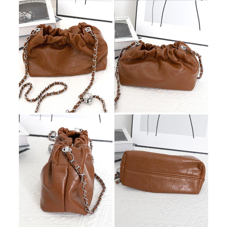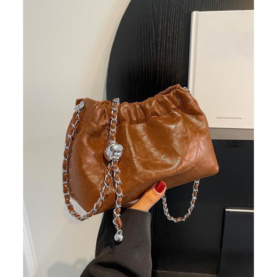 上品な光沢感とエレガントなデザインが魅力のモダンな巾着型ショルダーバッグ。