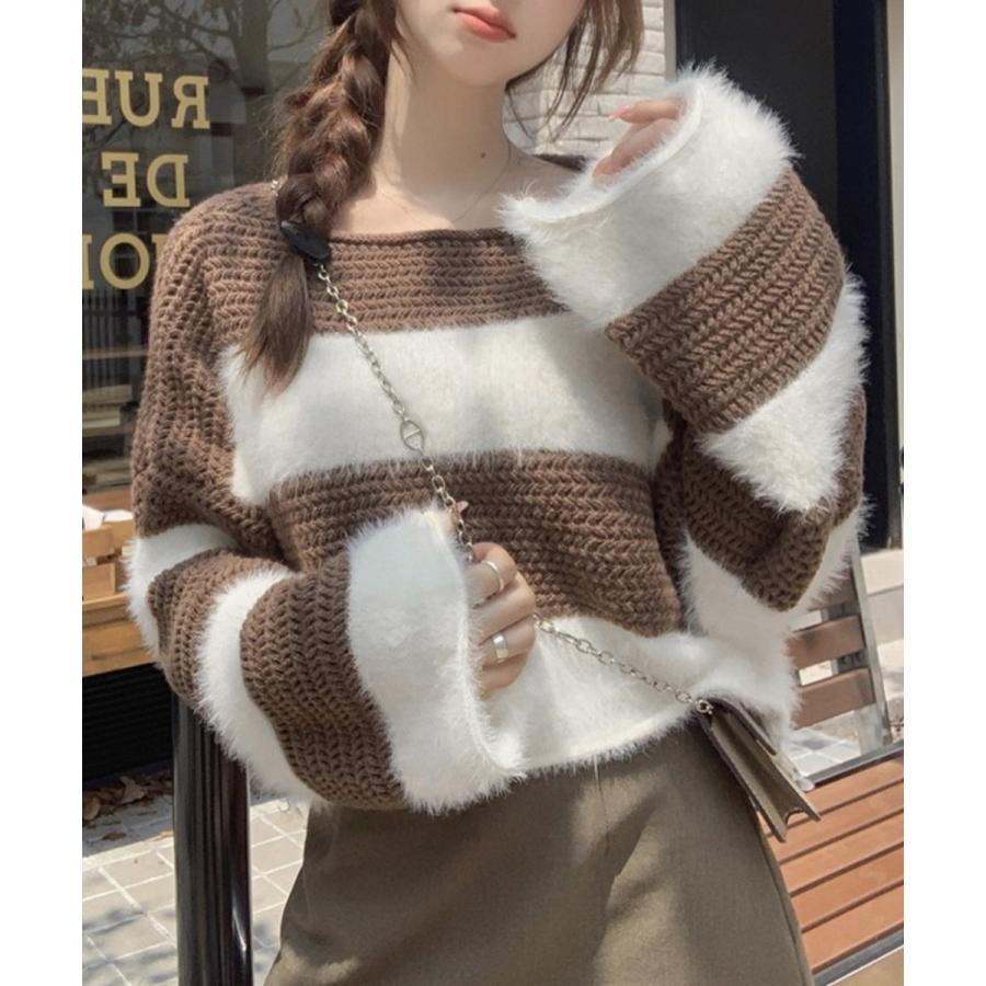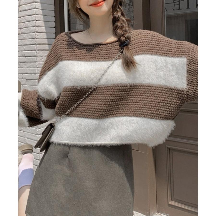 大人可愛いボーダーニットトップス 長袖 ゆったりニットセーター 着やせ 柔らかいニットプルオーバー ショートニット春秋冬