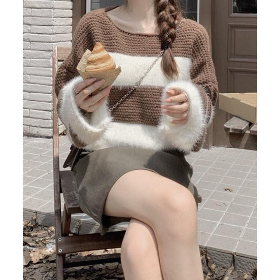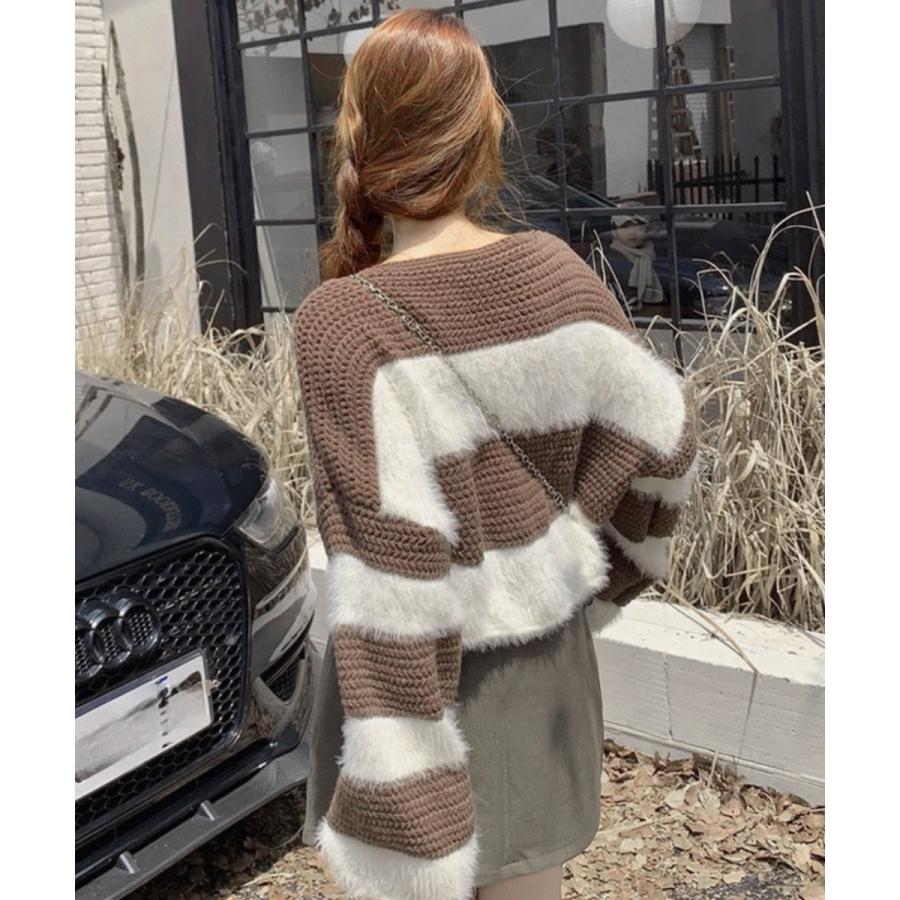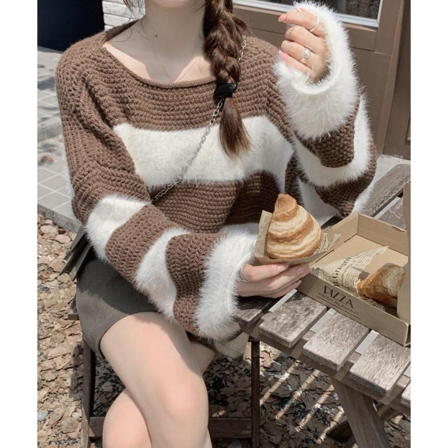 ふわふわのファー素材とざっくり編みを組み合わせたバイカラーニット。