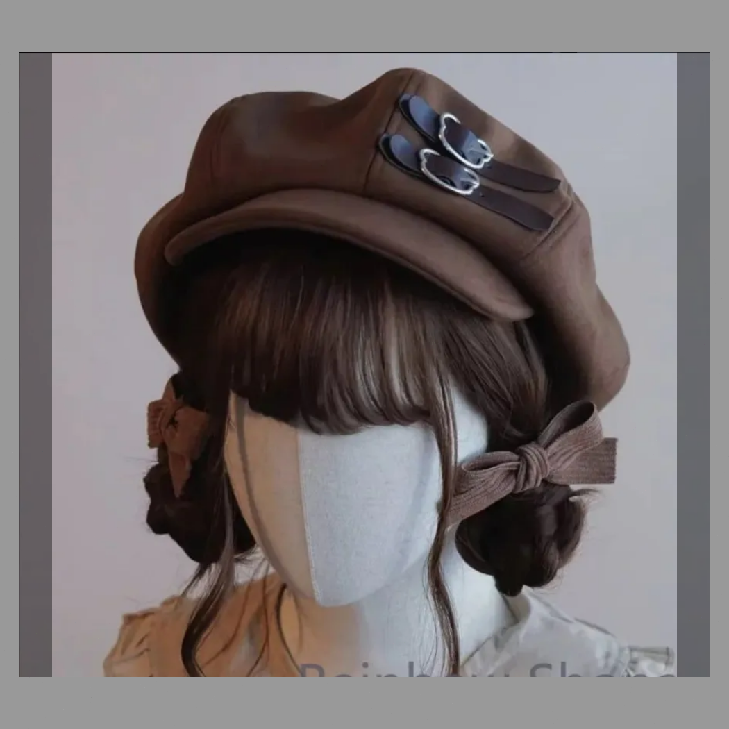 【新品】ガーリー レザーバックルキャスケット レディース★帽子★ブラウン ベレー帽 秋 冬 ロリータ キュート レザー