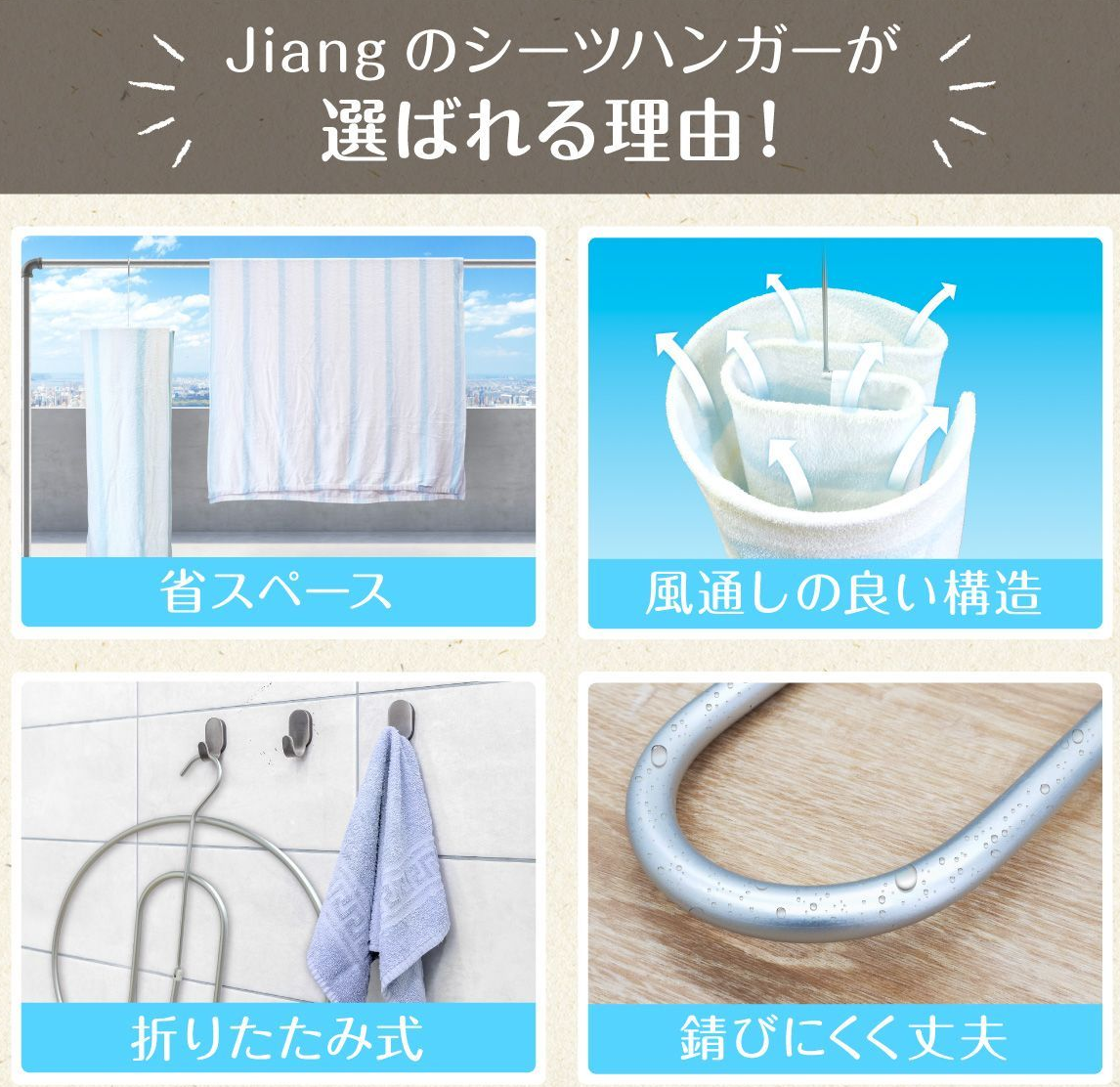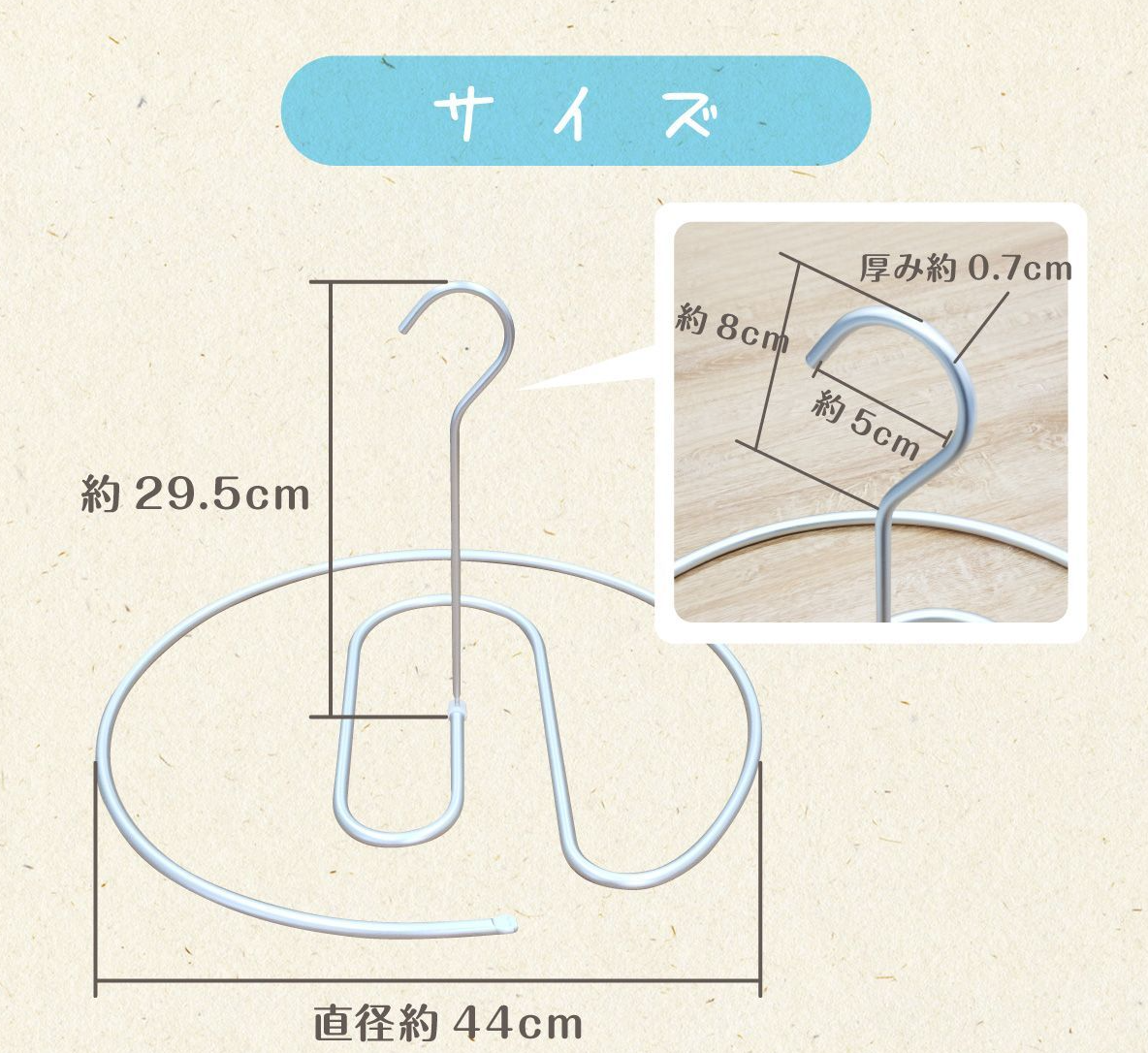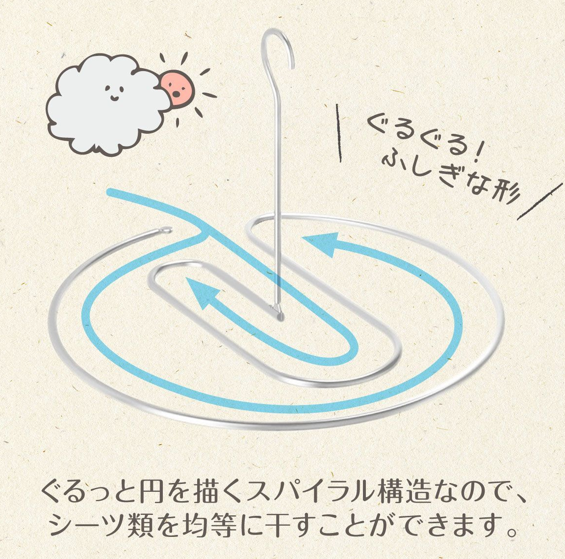 スパイラルハンガー 折りたたみ式 幅2.2mの衣類を約42cmのスペースで干すことができます。 乾きやすい円型で、衣類同士がくっつかないから風通りもいい 物干し竿で幅をとるシーツなどをハンガー1つでサッと干せます。 フックがついているので、風が強い地域でも安心して使えます。 使わない時は折りたたんで収納できます。 素材はアルミニウム合金を使用しているので、錆びにくく、雨に濡れても大丈夫。 1cmの厚みがあるハンガーなので20kgまで耐えられ、重たい衣類でも安心 室内や屋外でも大活躍間違いなし! サイズ:直径約42cm、高さ約28cm 重量:約0.5kg 素材:アルミニウム合金