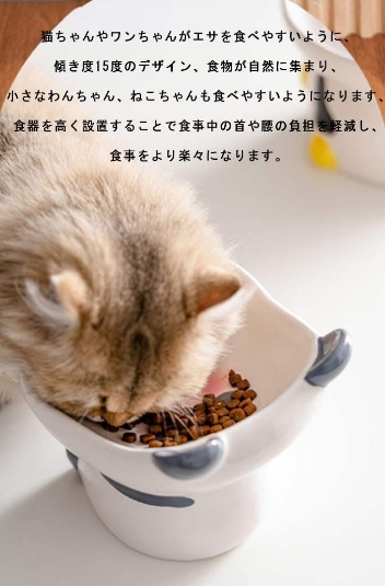 猫ちゃんやワンちゃんがエサを食べやすいように、傾き度15度のデザイン、食物が自然に集まり、小さなわんちゃん、ねこちゃんも食べやすいようになります、食器を高く設置することで食事中の首や腰の負担を軽減し、食事をより楽々になります。