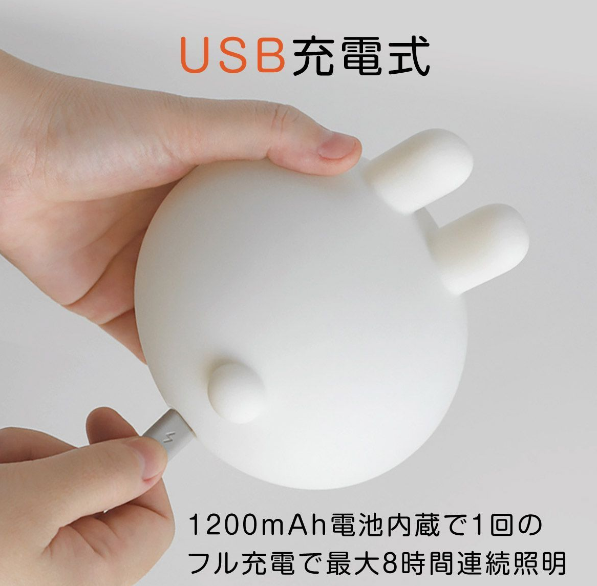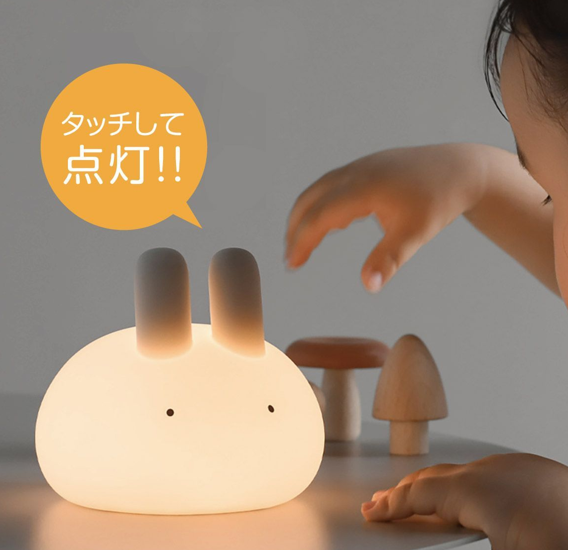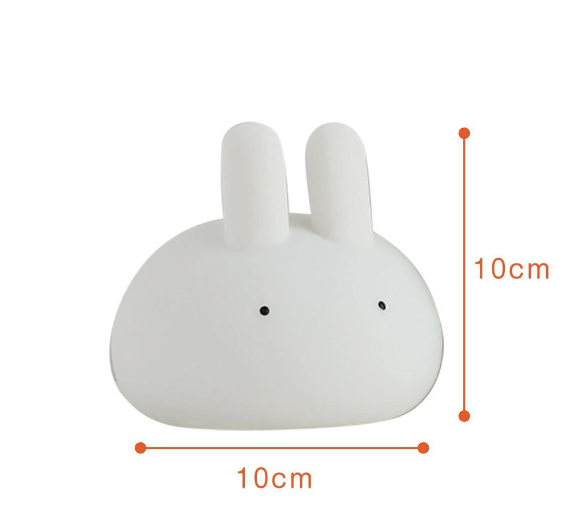うさぎのランプ 暖かいLEDライトで暗いのがこわい子供を守ります。柔らかい光で安心です。 LEDライトの色温度は2700Kで、夜間でもより快適に使用できます。 15分・30分タイマー付きで、子供の寝かしつけに最適な時間を設定できます。 柔らかいシリコン素材で安心です。 1200mAh電池内蔵で1回のフル充電で最大8時間連続照明ができます。 サイズ:10×10cm 重量:約156g