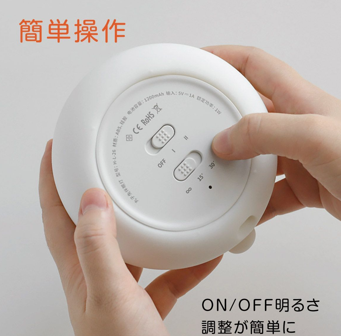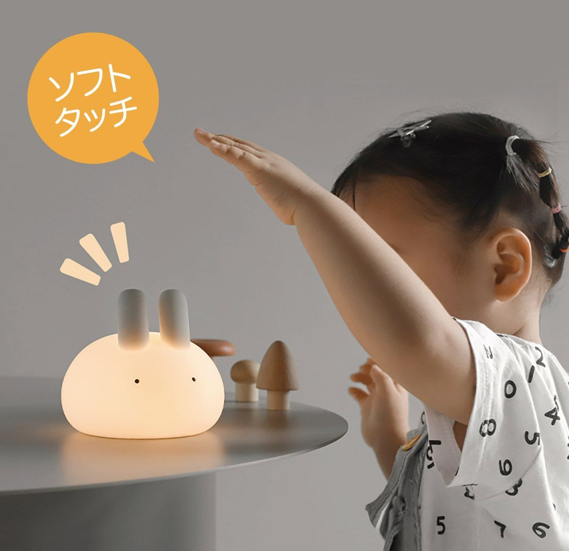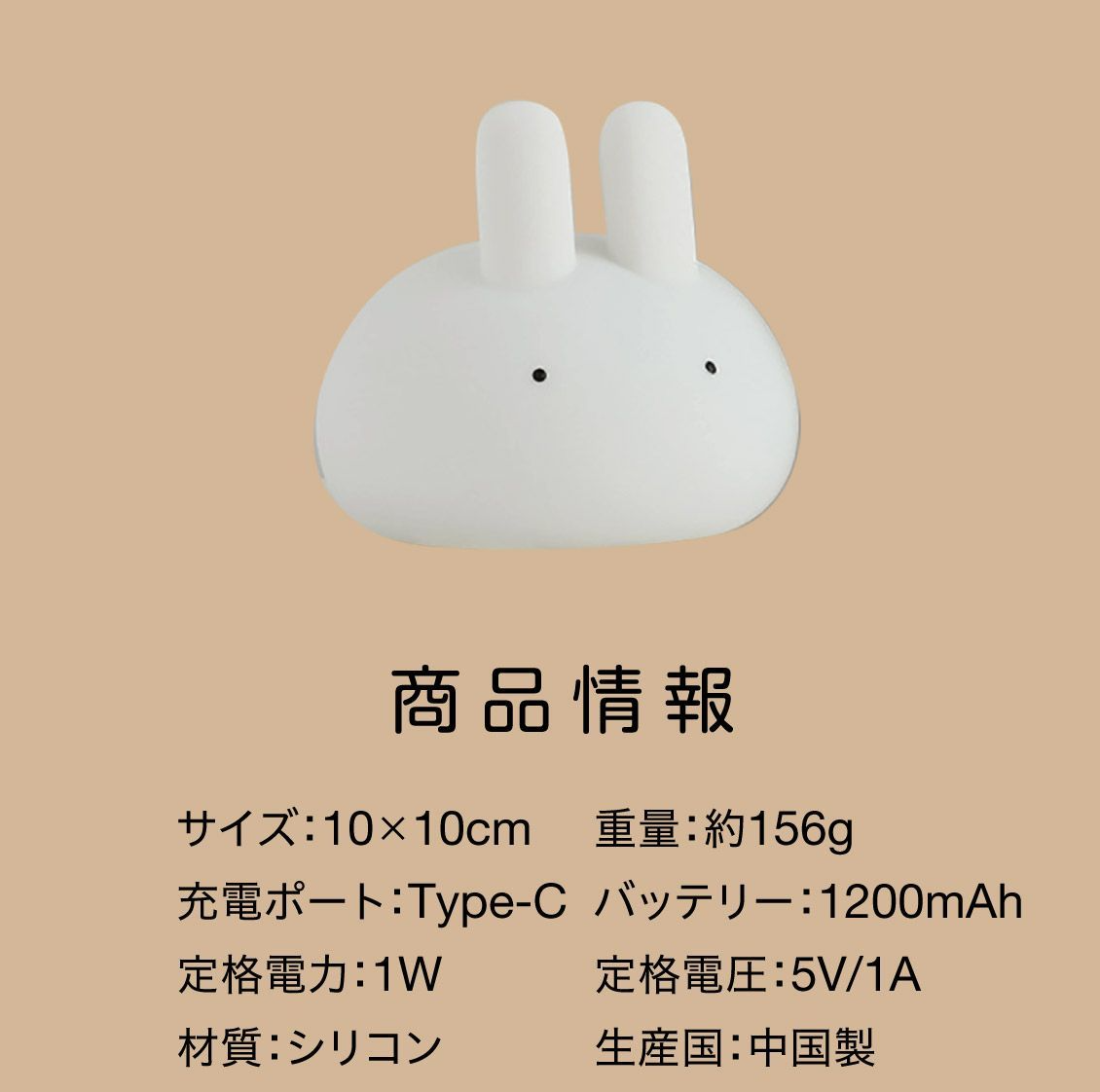 うさぎのランプ 暖かいLEDライトで暗いのがこわい子供を守ります。柔らかい光で安心です。 LEDライトの色温度は2700Kで、夜間でもより快適に使用できます。 15分・30分タイマー付きで、子供の寝かしつけに最適な時間を設定できます。 柔らかいシリコン素材で安心です。 1200mAh電池内蔵で1回のフル充電で最大8時間連続照明ができます。 サイズ:10×10cm 重量:約156g