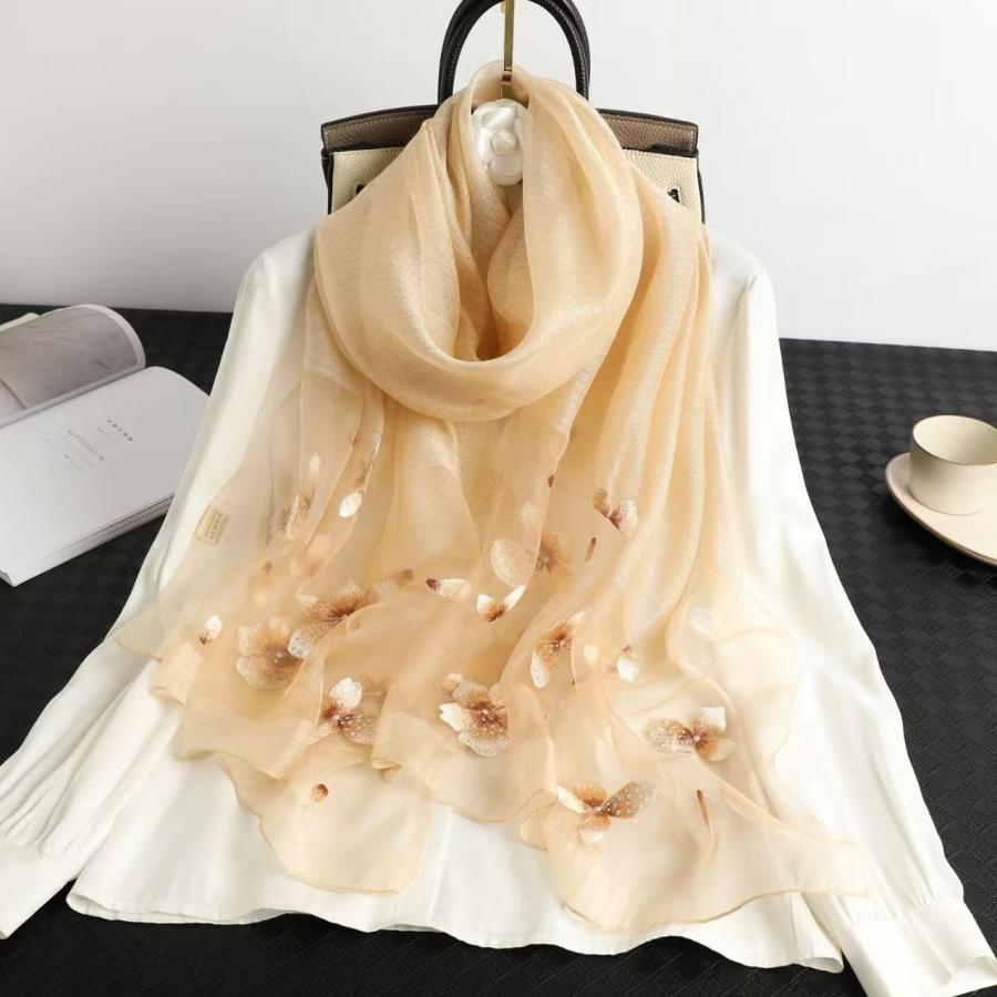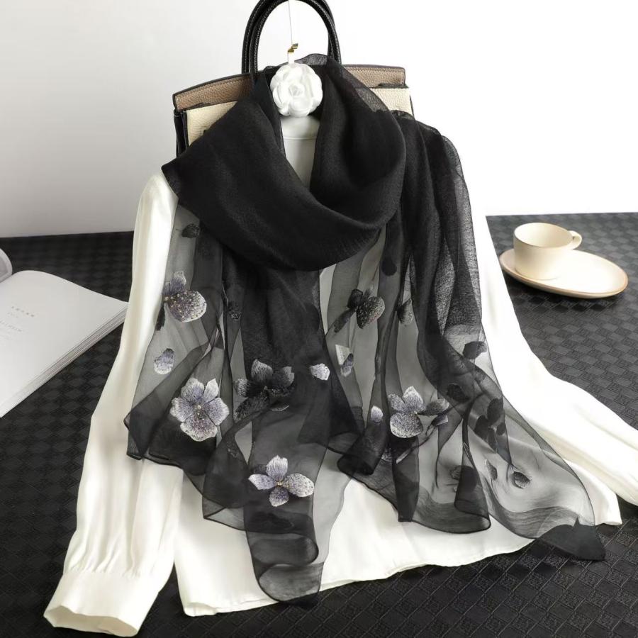 刺繍 マフラー シルク混 春 夏 秋 花柄刺繍 結婚式 レディース ファッション ストール 大判 巻物 ショール 肩掛け おしゃれ 日焼け止め