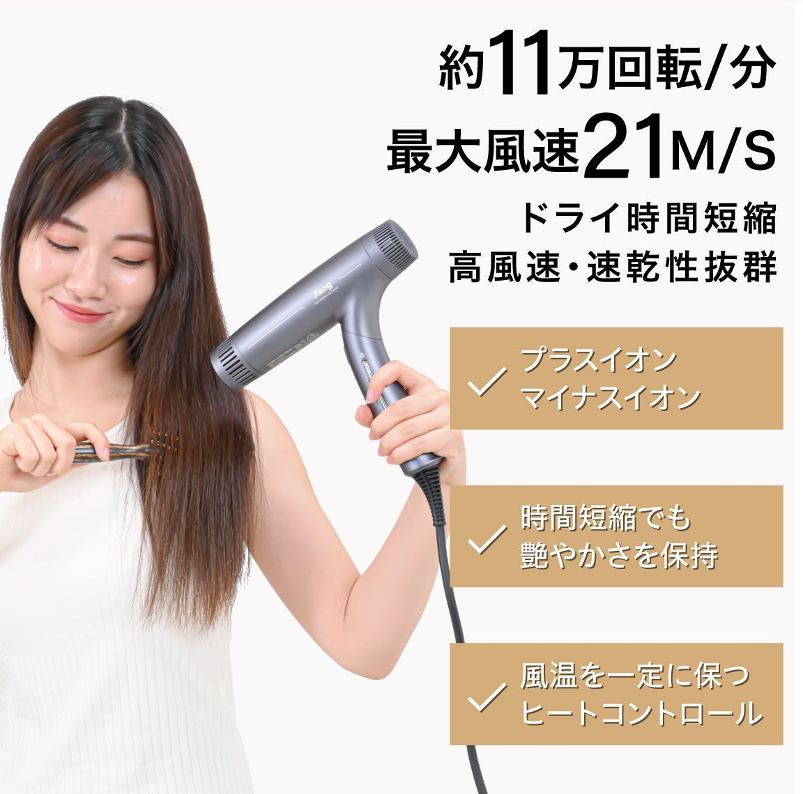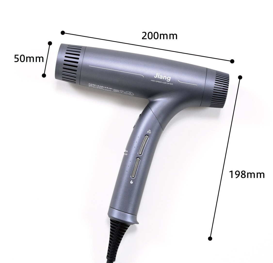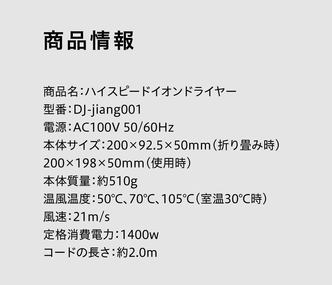 ドライ時間短縮!高風速・速乾性抜群! ハイスピードイオンドライヤー JIANGオリジナル 【高速11万回転/分&高風速・速乾性抜群】 高速バランスイオンドライヤーは、吸い込む空気を倍に増幅し、高圧・高速な風を生成します。送風ロスを回避しながら髪表面の水分を素早く取り去り、ドライヤーの使用時間を40%短縮できます。 【低騒音化&インテリジェント・ヒートコントロール】 低騒音化技術を取り込んだ羽根の形を採用し、夜中に使ってもまわりに迷惑をかけることがありません。温度が上がりすぎないように一定に保つ機能があり、キューティクルを保護しながらヘアカラーの退色を抑制します。 【12モード&メモリー機能】 4段階風温及び3段階風速の組み合わせで12つのモードを設定できるヘアードライヤーです。また、直近で設定した風速&温度を記憶するメモリー機能付きで、同じ設定条件で使いたい時に再度設定する手間が省けます。 【折りたたみ&自動クリーニング機能】 収納袋付きで携帯性が非常に高く、旅行の必須アイテムに。「自動クリーニング機能」を搭載しており、本体内部に溜まったゴミやホコリを自動で取り出し、メンテナンスフリーで清潔に長く使えます。